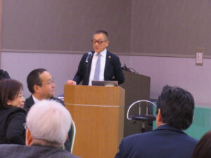名刺交換タイムの後、稗島会長あいさつ、田上税務署長の御来賓代表あいさつがあり、その後、山口福岡県酒造組合会長による講話「福岡の日本酒の今」がありました。